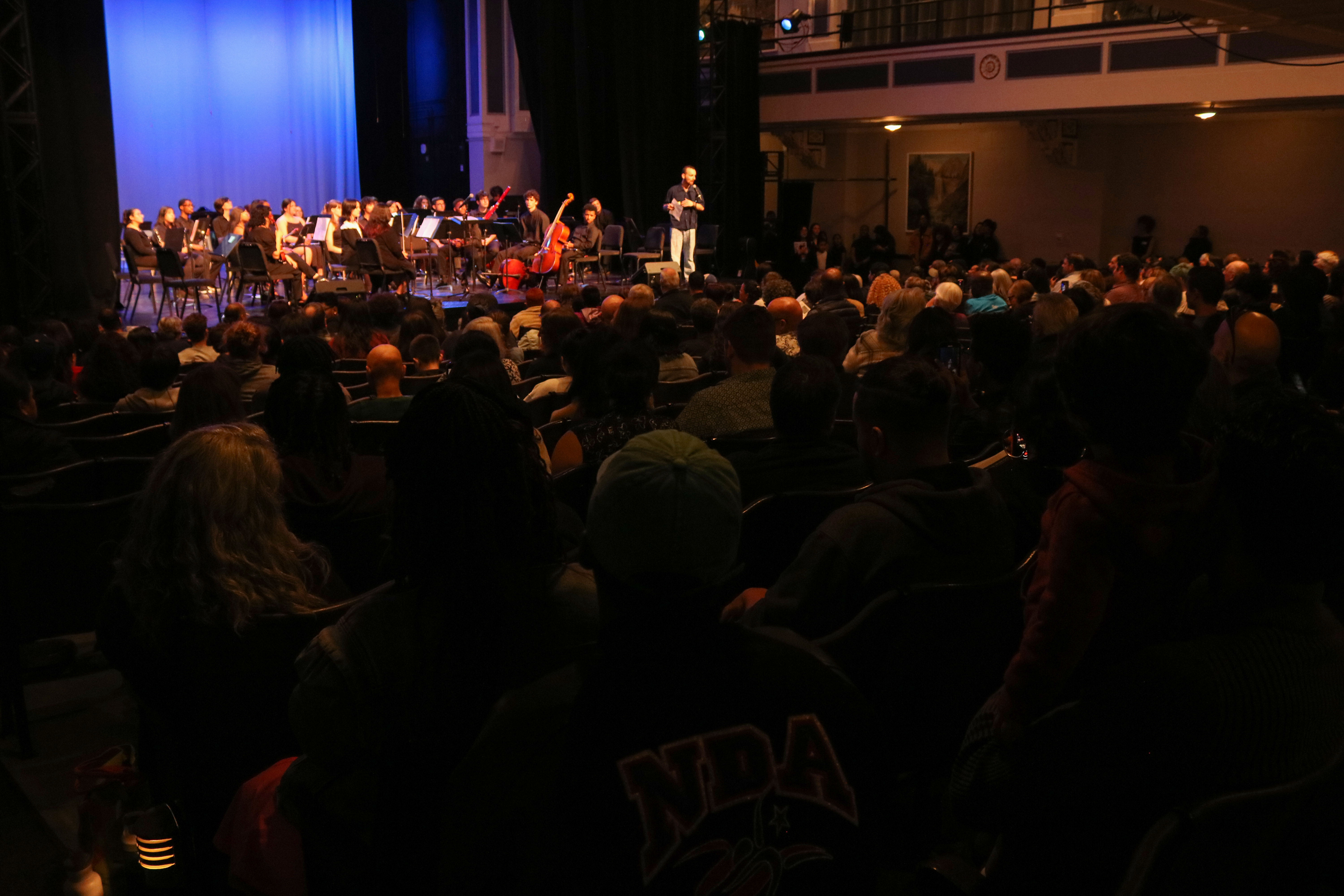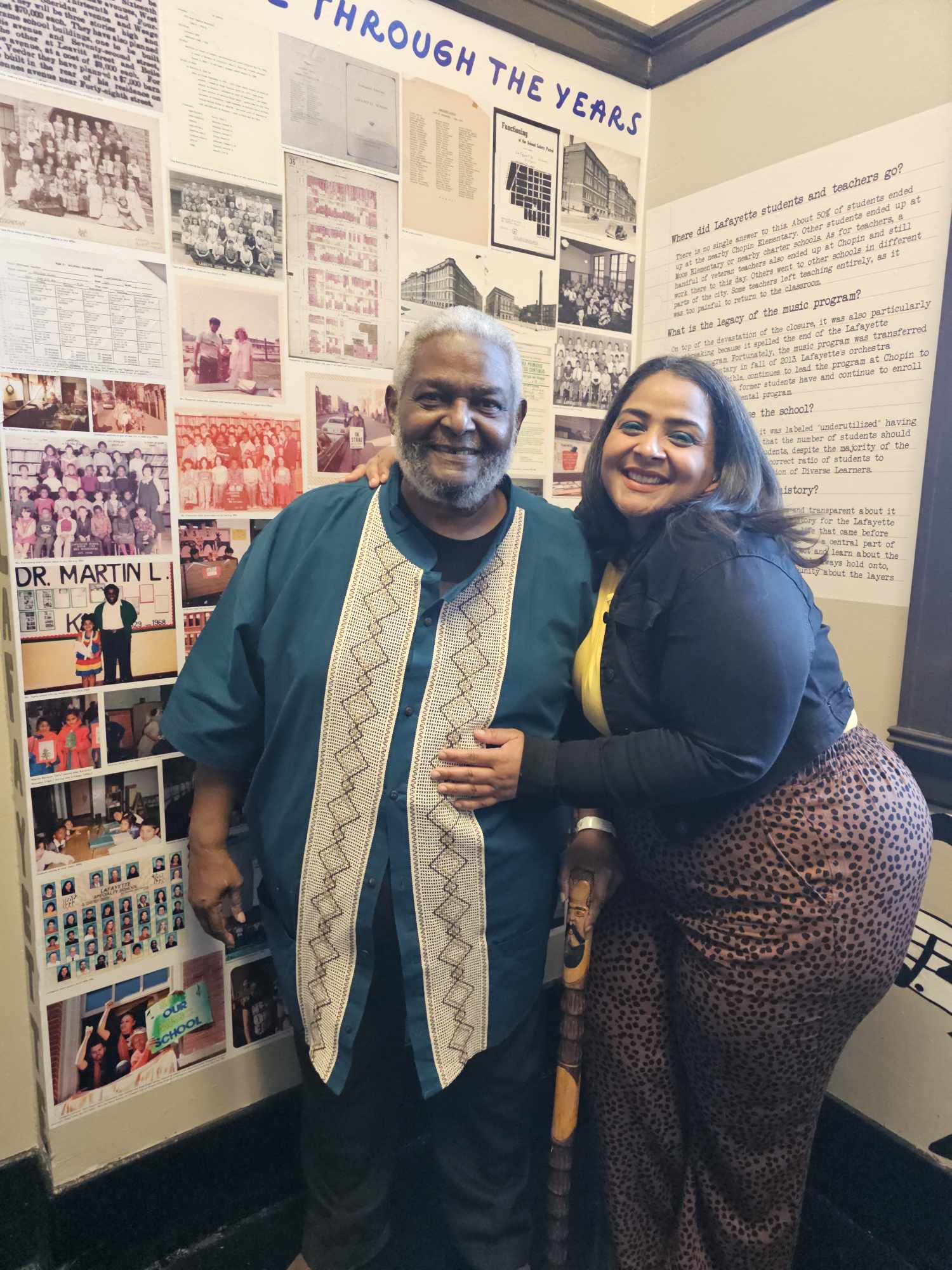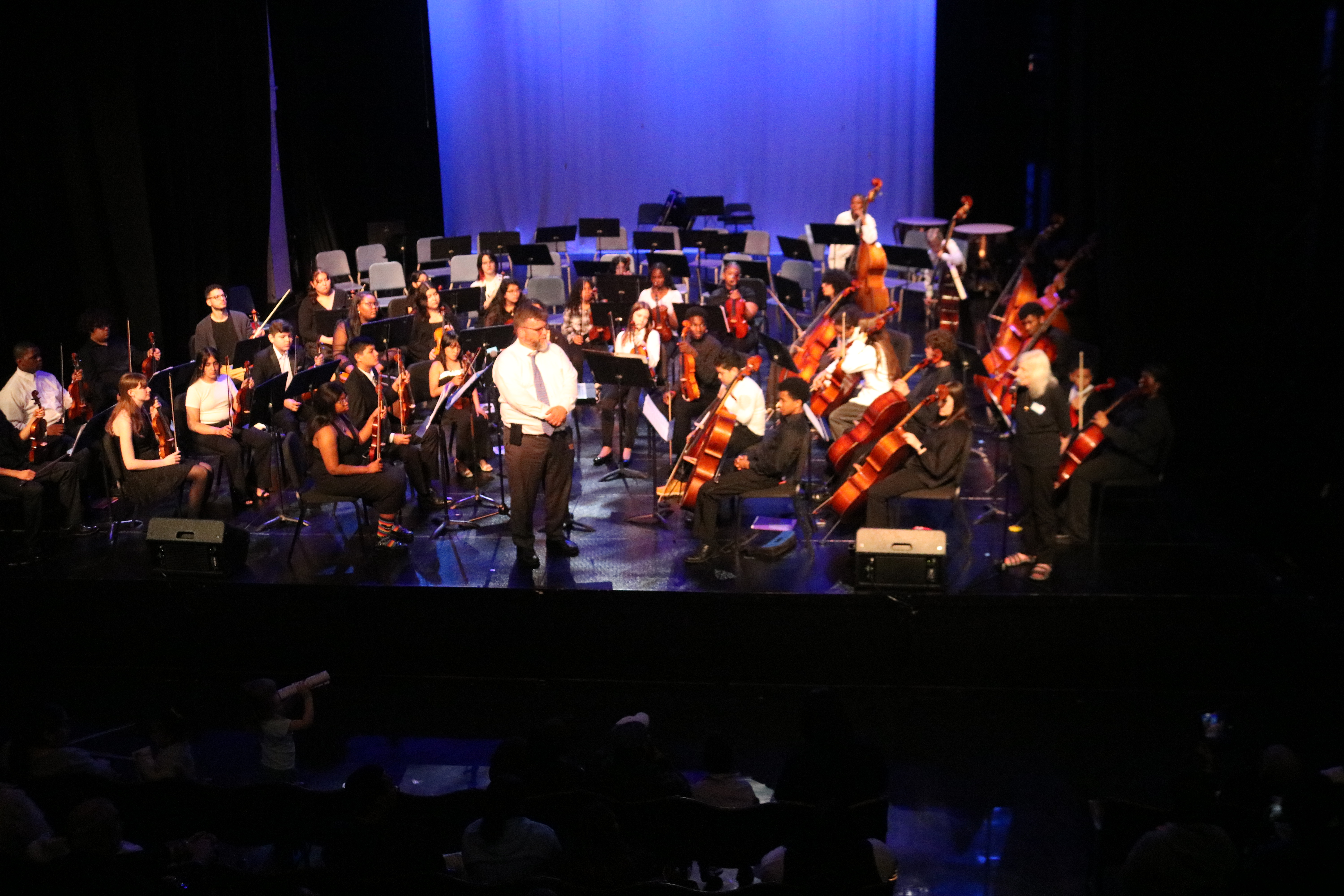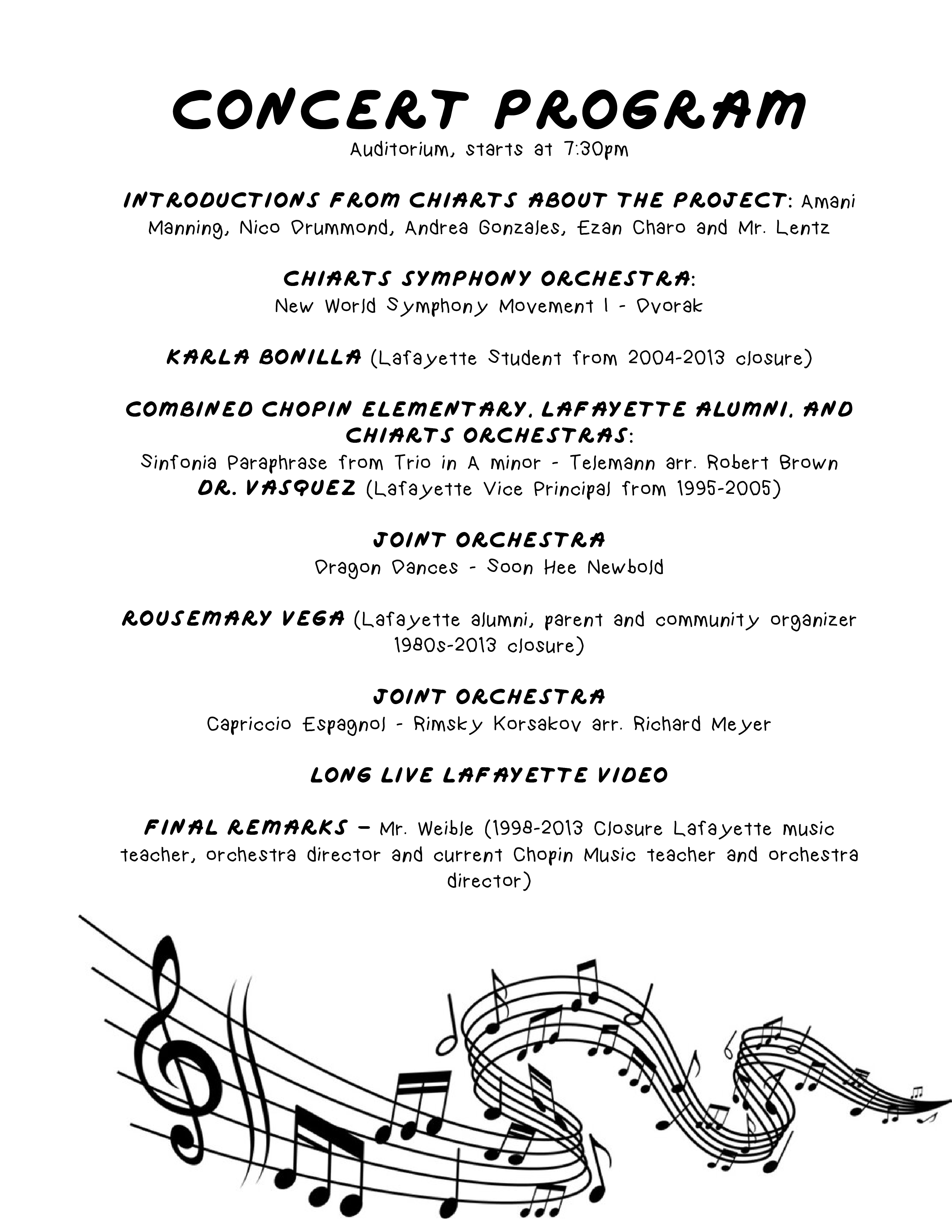 Originally suggested by Karla Hernandez during her interview for the project.. on May 15th, 2024 was a large-scale Lafayette reunion through a joint music concert with Lafayette Alumni, Chopin Elementary (the continued legacy of the music program) and the current ChiArts orchestra. Sharing the stage, Mr. Weible conducted students in the ChiArts/Lafayette auditorium for the first time since 2013 along with the shared lead of Mr. Ritchie (ChiArts Orchestra teacher). The interlude of each song featured a different speaker from Lafayette (as seen in the program below) to root the event in healing, perspective-taking, honest history and storytelling between intersecting communities.